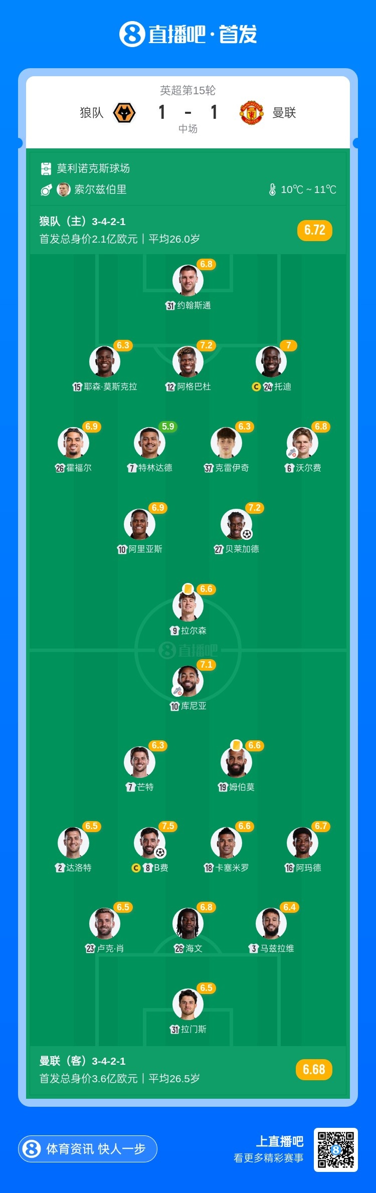 半场-曼联1-1狼队 B费“连滚带爬”破门达洛特失单刀贝莱加德扳平